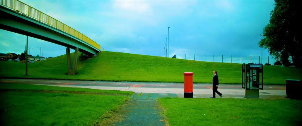 No sé si aporta algo, pero el cielo está teñido de azul cielo sobre nube. Más impuesto imposible. Cielo azul falso, sombras suaves de día de nube en un general. Hay una viñeta digital. Se puede ver en los lados cómo se funde a negro todo de forma artificial. Y los grises son muy, muy negros. Lo puedes ver en las sombras del propio puente (no la que hace el puente, las que hay en el mismo), el árbol (que suma el vignette y se ve casi negro) o la cabina de teléfono. Es una mezcla rara, que me parece cine de Fincher de los 2000, pero con colores supersaturados. Es una imagen muy digital. Me recuerda al prólogo y epílogo de 28 años después por lo digital e impuesto (pero más antiguo también).