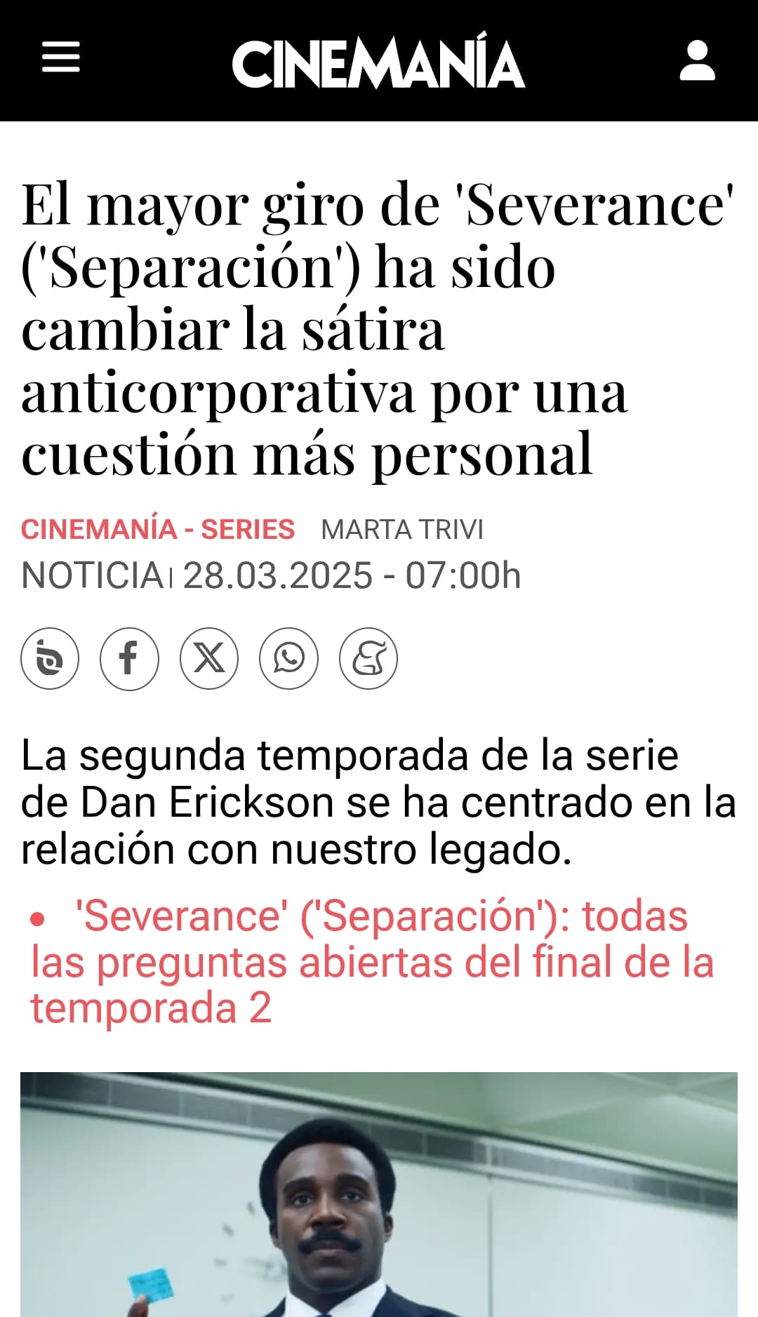 Por un lado, como dices, @Alphonsaurus es una serie muy Lost donde se pueden sacar mil teorías. Hay mucho misterio y mucha miga de pan y es divertido ir semana a semana discutiendo (como le ha pasado a @Ludipe yo también he tenido que aprender a disfrutar del viaje y entender que las resoluciones solo son satisfactorias en los misterios de cuarto cerrado/controlados). Pero por otro lado, al ser ciencia ficción, para mí es importante el tema, la metáfora que levanta, y, como decía, en esta segunda temporada creo que la escritura ha caído en ese sentido. Severance exploraba la división que todos sufrimos en nuestras vidas a causa del trabajo. Todos tenemos que ser otra persona durante ocho horas y es una locura que aceptamos sin más por diversos motivos. La primera temporada tenía mucho de sátira y eso lo ha perdido.
